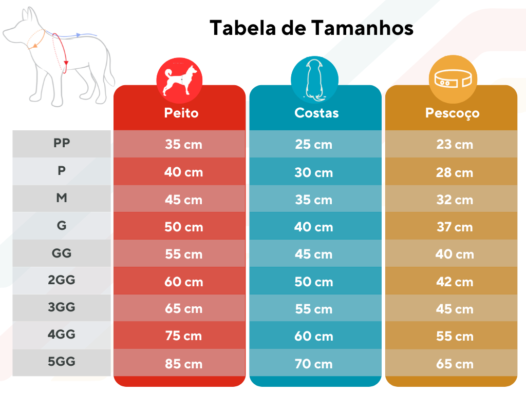Faça a medição do seu pet para identificar qual o tamanho mais indicado. São 3 medições para garantir que seu pet fique confortável: